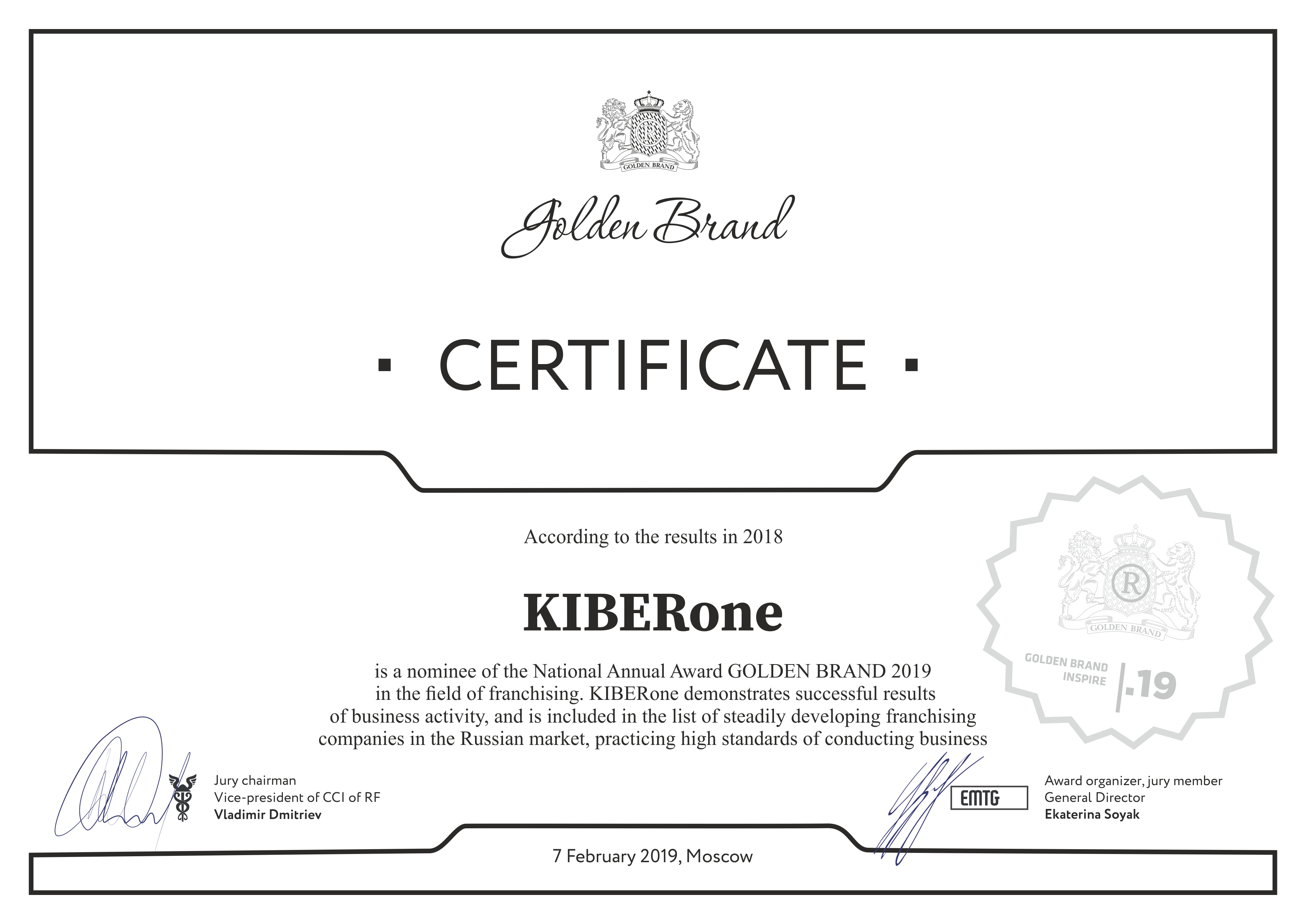 BREAKTHROUGH OF THE YEAR nominee for the national franchise award Golden Brand 2019